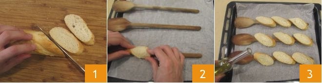 Pour réaliser la tartare de viande sur bruschetta, commencez par cette dernière : coupez la baguette en tranches obliques de ½ cm 1 ; puis recouvrez une plaque de cuisson de papier sulfurisé et déposez 3 cuillères en bois. Le manche des cuillères servira à donner une forme de barquette à vos tranches de pain. Disposez ensuite les tranches, une par une, et pressez sans les casser pour leur donner la forme 2. À la place des cuillères, vous pouvez utiliser des moules à cannoli, si vous en avez. Assaisonnez les tranches de pain avec de l'huile d'olive 3