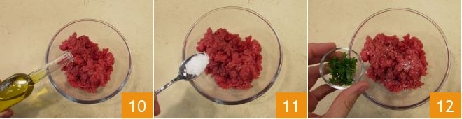 Transférez la viande dans un bol, assaisonnez avec l'huile 10, les flocons de sel 11, un tour de moulin de poivre noir et de la ciboulette hachée 12. Mélangez et mettez de côté un moment.