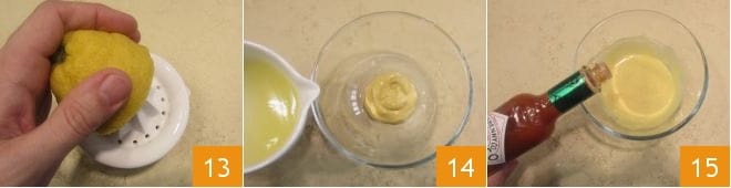 Occupez-vous maintenant de la sauce d'accompagnement : pressez le jus de citron 13. Dans un petit bol, versez la moutarde, ajoutez le jus de citron 14 et assaisonnez avec quelques gouttes de tabasco 15.