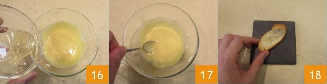 Enfin, versez le miel d'acacia 16 et émulsionnez le tout avec une cuillère à café 17. Composez la tartare sur bruschetta : déposez les tranches de pain grillées sur un plat de service en gardant la partie concave vers le haut 18,