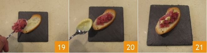déposez un peu de tartare 19, assaisonnez avec quelques gouttes de sauce à la moutarde 20 et continuez pour les autres ; dégustez immédiatement votre tartare de viande sur bruschetta 21 !