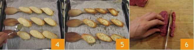et de l'origan 4. Mettez au four à chaleur tournante préchauffé à 190° pendant 10 minutes, ou jusqu'à ce que le pain soit bien doré, puis sortez-le du four et laissez-le tiédir 5. Maintenant, occupez-vous de la viande : prenez le filet de bœuf (très frais) déposez-le sur une planche à découper et retirez l'excès de gras si présent. Ensuite, réduisez la viande en lanières 6