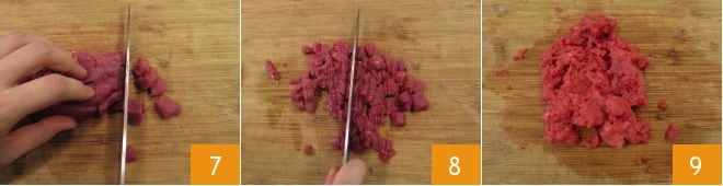 et ensuite découpez en dés 7. Hachez finement les dés de bœuf avec un couteau en frappant sur la planche avec la lame 8 jusqu'à obtenir une consistance douce et crémeuse 9.