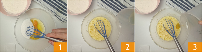 Pour préparer le gâteau à l'eau au cacao, commencez par travailler dans un saladier les œufs avec le sucre à l'aide d'un fouet à main ou électrique 1. Une fois que le mélange est homogène et crémeux, ajoutez l'eau 2, l'huile de tournesol 3 et le sel.