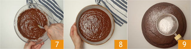 Mélangez bien jusqu'à obtenir un mélange lisse et homogène 7. Versez dans un moule légèrement huilé et fariné de 24 cm de diamètre et égalisez bien, en secouant doucement le moule 8. Enfournez dans un four statique à 180° pour 40 minutes dans la partie médiane du four. Faites le test du cure-dent pour vérifier la cuisson. S'il en ressort sec, le gâteau est prêt et vous pouvez le sortir du four. Laissez bien refroidir avant de le démouler et garnissez de sucre glace à votre convenance 9.