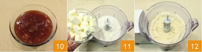 Versez-la dans un bol pour la laisser refroidir 10 et, entre-temps, préparez la pâte sablée. Placez dans un mixeur la farine tamisée, une pincée de sel et le beurre froid du réfrigérateur coupé en dés 11. Mixez le tout jusqu'à obtenir une texture sableuse 12,