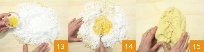 puis transférez-le sur un plan de travail (ou dans un bol) et ajoutez le sucre glace tamisé et l'écorce de citron 13. Formez un puits et versez au centre les jaunes d'œufs. Mélangez le tout avec une fourchette 14, puis continuez à travailler la pâte avec les mains pendant quelques minutes 15, jusqu'à ce qu'elle soit compacte mais sans trop la chauffer.