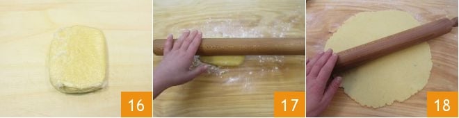 Donnez-lui ensuite la forme d'un pâton, enveloppez-le dans du film alimentaire 16 et mettez-le au réfrigérateur pendant au moins 30 minutes. À ce stade, reprenez la pâte sablée et étalez-la sur un plan légèrement fariné 17 jusqu'à obtenir un cercle d'environ 1 cm d'épaisseur 18.