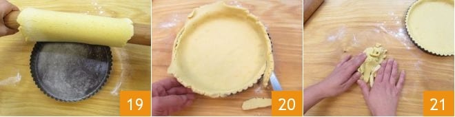 À l'aide du rouleau à pâtisserie, soulevez la pâte déjà étalée et placez-la sur le moule circulaire de 22,5 cm de diamètre 19. Pressez-la légèrement avec les mains pour la faire adhérer au moule et découpez l'excédent de pâte avec un couteau 20. Pétrissez à nouveau les chutes de pâte 21 et mettez-les de côté.