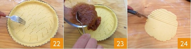 Piquez avec les dents d'une fourchette le fond de la tarte 22 et versez à l'intérieur la confiture de figues, désormais froide 23. Étalez la pâte restante jusqu'à obtenir une épaisseur d'environ 1 cm et, à l'aide d'une roulette festonnée, découpez des bandes de pâte d'environ 2 cm de large 24.