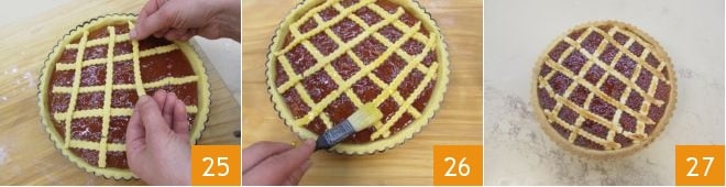 Puis placez-les sur la tarte d'abord horizontalement puis verticalement afin de former des losanges 25. Badigeonnez la surface des bandes de pâte avec l'œuf battu précédemment 26 et enfournez dans un four statique préchauffé à 180° pendant 30 minutes (si vous utilisez un four à chaleur tournante, cuisez à 160° pendant environ 20 minutes). Une fois sortie du four 27, laissez tiédir et servez votre tarte aux figues.
