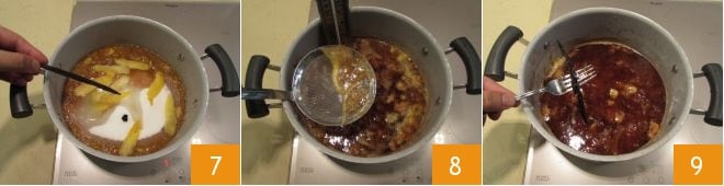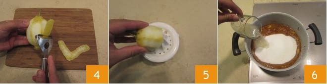 Entre-temps, avec l'aide d'un éplucheur, pelez la moitié d'un citron 4, en réservant les écorces, et extrayez-en le jus, en le filtrant des pépins 5. Une fois que le mélange de figues a atteint l'ébullition, ajoutez dans la casserole le sucre et le jus de citron 6.