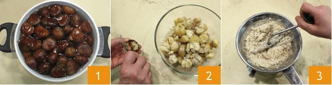 Pour préparer la tarte à la crème de marrons, commencez par préparer la crème : lavez soigneusement les marrons sous l'eau courante. Ensuite, transférez-les dans une grande casserole remplie d'eau et, une fois l'ébullition atteinte, laissez-les bouillir pendant 15 minutes 1. Passé ce temps, égouttez-les et laissez-les tiédir, puis enlevez la peau avec l'aide d'un couteau bien aiguisé 2. Une fois épluchés, placez-les dans un presse-purée jusqu'à obtenir une texture sablonneuse 3 ; alternativement, vous pouvez utiliser un presse-purée.