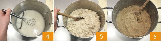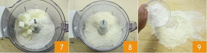 Pendant que la crème de marrons cuit, occupez-vous de la préparation de la pâte sablée : versez la farine et le beurre froid en morceaux dans le bol d'un mixeur 7 et activez jusqu'à obtenir une texture sablonneuse 8. Ensuite, transférez le « sablage » sur un plan de travail et formez un puits au centre, où vous verserez le sucre glace 9.