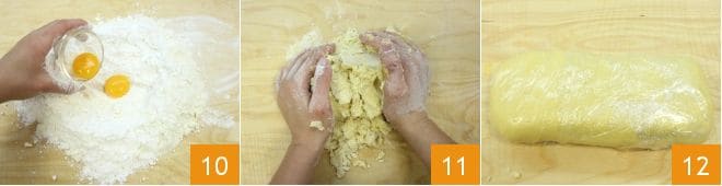 Cassez les œufs, mettez de côté les blancs et ajoutez les jaunes au « sablage » et au sucre 10, amalgamez le tout et travaillez rapidement avec les mains 11 pour éviter que la pâte ne chauffe, jusqu'à former un pain ferme et homogène. Enroulez-le dans du film plastique et laissez-le reposer au réfrigérateur pendant une demi-heure 12. Pour savoir comment la préparer au mieux, consultez notre école de cuisine : pâte sablée.