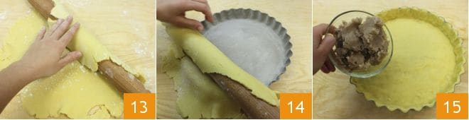 Une fois la crème de marrons et la pâte sablée préparées, il ne vous reste plus qu'à étaler la pâte et assembler votre tarte. Sortez le pain du frigo, enlevez le film plastique et étalez un cercle de pâte sablée avec un rouleau à pâtisserie 13. Beurrez et farinez un moule à tarte de 28 cm de diamètre, puis posez-y la pâte sablée 14 ; pour vous faciliter cette opération, enroulez la pâte sur le rouleau puis déroulez-la sur le moule. Exercez une légère pression le long du périmètre du moule avec le rouleau, afin d'éliminer l'excédent de pâte, enfin pressez avec les doigts pour faire adhérer la pâte au moule. Ensuite, versez la crème de marrons, qui entre-temps aura tiédi 15.