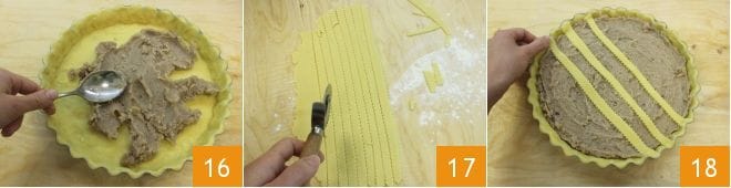 Nivelez la crème de marrons avec le dos d'une cuillère 16, étalez la pâte sablée restante et découpez des bandes de pâte avec un emporte-pièce 17, puis disposez-les sur la surface de la tarte, formant les traditionnels losanges 18.