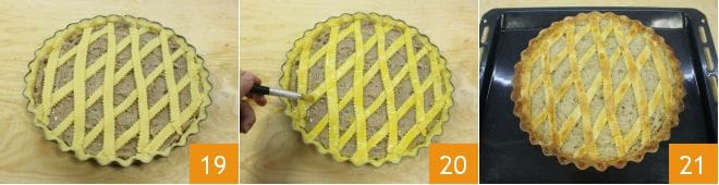 Une fois toutes les losanges posées 19, badigeonnez la pâte sablée d'œuf 20 pour donner croquant et brillance à la tarte et enfin enfournez dans un four statique préchauffé à 180 degrés pour 45 minutes, si vous utilisez un four ventilé, faites cuire à 160 degrés pendant environ 35-40 minutes. Une fois sortie du four, laissez refroidir votre tarte à la crème de marrons 21 et servez-la !