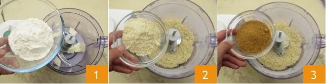 Pour préparer la tarte à la crème de thé matcha, commencez par préparer la pâte sablée. Placez le beurre froid coupé en dés dans le bol d'un mixeur équipé de lames, ajoutez la farine T45 1 et mixez le tout jusqu'à obtenir un mélange sableux. Ajoutez ensuite la poudre d'amandes 2, le sucre de canne intégral 3 et mixez à nouveau jusqu'à obtenir un mélange homogène.