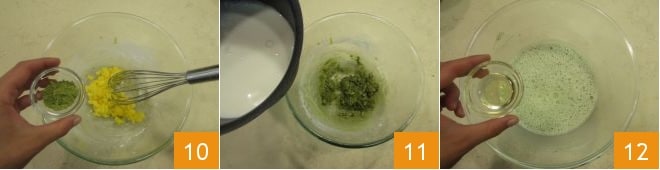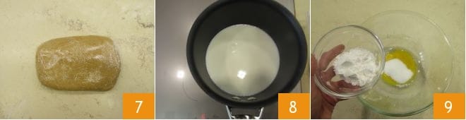 Formez une boule et enveloppez-la dans un film alimentaire 7 et placez-la au réfrigérateur pour la raffermir pendant au moins 40 minutes. En attendant, préparez la crème au thé matcha. Versez le lait dans une casserole 8 et chauffez-le jusqu'à frôler l'ébullition. Pendant ce temps, versez dans un bol les jaunes d'œufs, le sucre et la fécule de maïs 9 ; fouettez rapidement avec un fouet.