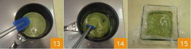 et remettez le mélange dans la casserole 13. Faites cuire pendant quelques minutes à feu doux, en remuant constamment jusqu'à ce que la crème épaississe 14. À ce stade, versez-la dans un plat, couvrez d'un film en contact direct 15 et laissez refroidir au réfrigérateur.