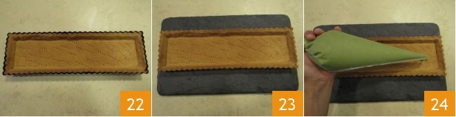 Faites cuire dans un four statique préchauffé à 170° pendant environ 15 minutes sur la grille du milieu jusqu'à ce qu'elle soit bien dorée 22. Puis laissez-la refroidir complètement avant de la démouler 23. À ce stade, travaillez la crème pendant quelques secondes avec une spatule, transférez-la dans une poche à douille et utilisez-la pour garnir la tarte 24.