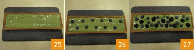 Niveau ensuite la surface 25 et décorez avec des myrtilles fraîches 26, des mûres et quelques feuilles de menthe. Votre tarte au thé matcha est prête à être servie 27 !