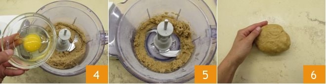 À ce stade, ajoutez l'œuf entier 4 et mixez à nouveau le tout 5. Transférez ensuite la pâte sablée sur un plan légèrement fariné et travaillez-la pendant quelques secondes 6.