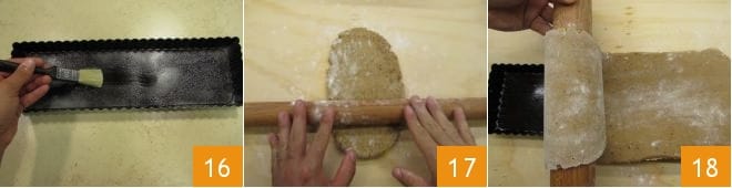 Maintenant, beurrez un moule rectangulaire de 35,5x10,5 16. Reprenez la pâte sablée et étalez-la sur un plan légèrement fariné 17, de manière à obtenir un rectangle d'une épaisseur d'un demi-cm. Aidez-vous du rouleau à pâtisserie pour transférer la pâte sur le moule 18