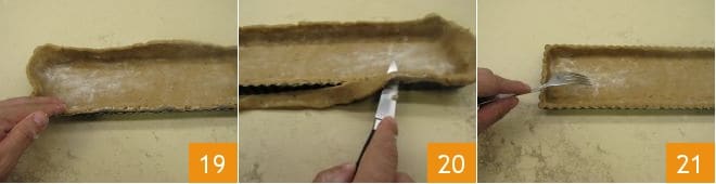 et avec les doigts, faites adhérer la pâte sablée au moule 19. Retirez l'excédent de pâte à l'aide d'un petit couteau 20 et piquez le fond de la tarte avec une fourchette 21.