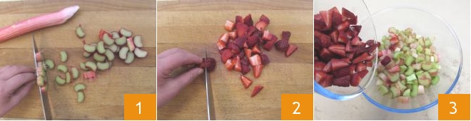 Pour préparer la tarte à la rhubarbe, commencez par vous occuper de la garniture : nettoyez la rhubarbe en la débarrassant de ses feuilles et de ses filaments comme s'il s'agissait d'un céleri. Coupez la tige de la rhubarbe en morceaux 1, puis nettoyez les fraises et coupez-les en 4 2. Mélangez fraises et rhubarbe dans un bol 3,