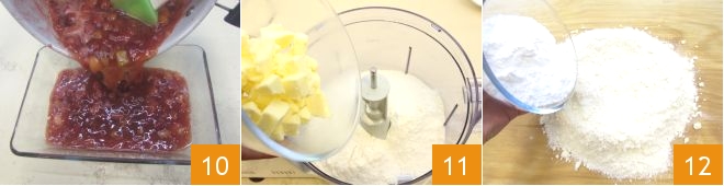 Quand la confiture de rhubarbe est prête, transférez-la dans un bol pour la laisser refroidir 10. Pendant ce temps, occupez-vous de la pâte sablée : dans le mixeur, réunissez la farine et le beurre froid du réfrigérateur coupé en morceaux 11. Mixez le tout pour obtenir un mélange ayant l’aspect sablonneux, puis versez-le sur le plan de travail, formant la classique fontaine, et ajoutez le sucre glace 12.