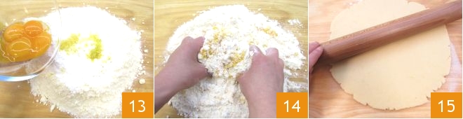Incorporez également le zeste de citron râpé et les jaunes d'œufs 13, et pétrissez brièvement 14, juste assez pour rendre la pâte compacte. Formez une boule, enveloppez-la de film plastique et laissez-la durcir au réfrigérateur pendant 30 minutes. Une fois le temps écoulé, étalez la pâte avec un rouleau à pâtisserie sur environ 1 cm d'épaisseur 15.