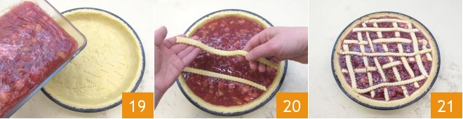 Avec le rouleau à pâtisserie, étalez-la à l’intérieur du moule de 25 cm de diamètre beurré et fariné, en la faisant adhérer à la base et aux bords par de petites pressions des doigts 16. Avec un petit couteau, éliminez l'excédent de pâte, en le conservant, et piquez la base de la tarte avec les dents d'une fourchette 17. Pétrissez à nouveau l'excédent de pâte, et étalez-le à nouveau pour en tirer, avec un emporte-pièce, des bandelettes 18 que vous utiliserez pour la décoration.