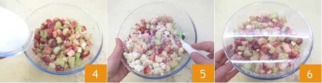 ajoutez le sucre 4 et mélangez bien 5, puis couvrez avec du film plastique 6 et laissez reposer pendant 2-3 heures, de manière à permettre à la rhubarbe de libérer son liquide.