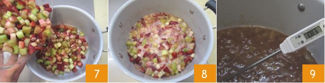 Une fois le temps écoulé, transférez les fraises et la rhubarbe dans une casserole 7 et faites cuire pendant 10 minutes à feu moyen, puis pendant encore 50-60 minutes à feu doux. À ce stade, faites fondre dans la confiture la fécule de pomme de terre 8 et laissez le mélange sur le feu jusqu'à ce qu'il atteigne 108° (vous pouvez vérifier la température avec un thermomètre de cuisine) 9.