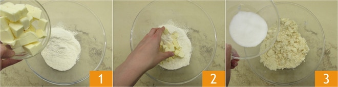 Pour préparer la tarte ricotta et myrtilles, commencez par la préparation de la pâte sablée. Versez dans un bol le beurre froid avec la farine 1, pinçez-le rapidement du bout des doigts 2, pour ne pas trop le réchauffer. Vous devez obtenir une texture sableuse. À ce stade, ajoutez le sucre 3 et travaillez-le pendant quelques instants.