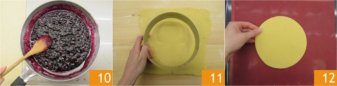 Quand les myrtilles sont légèrement écrasées et que la compote commence à épaissir, éteignez le feu et ajoutez le jus de citron, mélangez 10 et réservez. Beurrez et farinez un moule à cercle de 18 cm. Prenez la pâte, étalez-la à une épaisseur d'environ 5 mm et découpez-la avec le moule 11. Placez la pâte découpée sur une plaque de cuisson recouverte du tapis en silicone approprié (ou simple papier sulfurisé) 12.