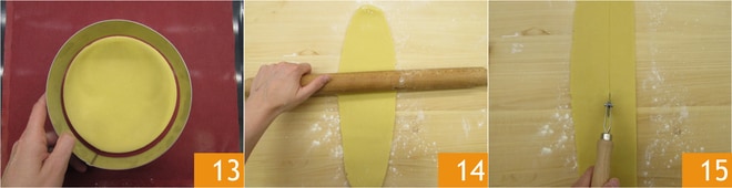 Posez également le moule 13. Avec la pâte restante, créez le bord : étalez 14 et découpez une bande de 4 cm de large et de la longueur de l'anneau (environ 60 cm) 15.