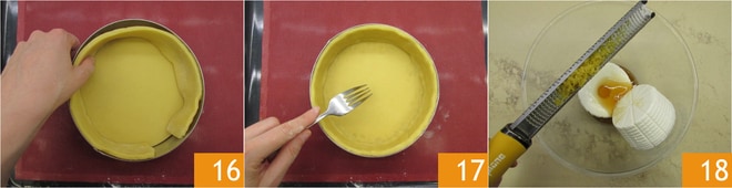Placez la bande de pâte en l'adhérant bien à l'anneau 16, pour éviter qu'elle ne plisse pendant la cuisson. Percez le fond de la pâte avec une fourchette 17 et laissez refroidir au réfrigérateur pendant au moins 30 minutes. Préparez la garniture : dans un bol, mélangez la ricotta, le miel et le zeste de citron 18.