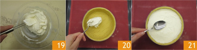 Réservez la crème 19. Une fois le temps écoulé, garnissez avec la crème de ricotta 20 et nivelez avec le dos d'une cuillère 21.