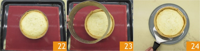 Cuire au four statique préchauffé à 180° pendant environ 45 minutes. Une fois sortie du four, laissez tiédir, retirez l'anneau 23 et transférez sur le plat de service 24.