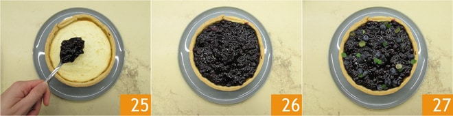Versez la compote rapide de myrtilles 25 26 et décorez avec d'autres myrtilles fraîches et des feuilles d'origan frais. La tarte ricotta et myrtilles est prête à être servie 27.