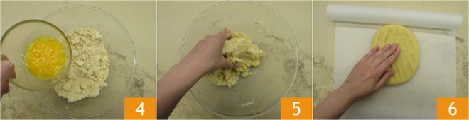 Ajoutez l'œuf 4 et pétrissez pendant peu de temps 5, pour rassembler le tout. Formez une boule et placez-la entre deux feuilles de papier sulfurisé, en l'aplatissant légèrement 6.