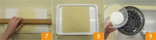 Étalez-la légèrement avec un rouleau à pâtisserie 7, en lui donnant une forme carrée 8 : laissez reposer au réfrigérateur pendant 30 minutes. Pendant ce temps, préparez la compote de myrtilles : versez les myrtilles dans une petite casserole légèrement chauffée et ajoutez le sucre 9. Laissez cuire à feu moyen-vif pendant environ 10 minutes, en remuant de temps en temps.