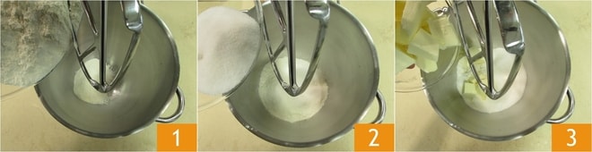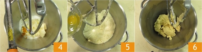 Ajoutez également le zeste d'orange et le zeste de citron, tous deux râpés 4. Travaillez avec la feuille environ 2 minutes pour obtenir une pâte sablonneuse. À ce stade, ajoutez à la fois l'œuf 4 et le jaune. Travaillez encore quelques minutes, jusqu'à obtenir une pâte compacte et uniforme 6. Essayez de ne pas travailler trop longtemps la pâte, évitez de la chauffer excessivement, afin de ne pas créer de réseau glutineux qui rendrait la pâte compacte et non friable.