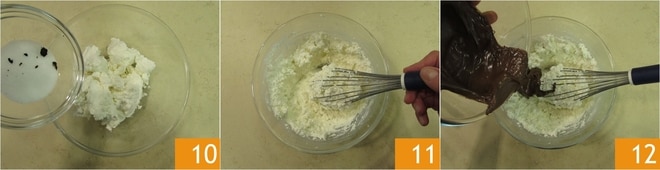 Versez ensuite la ricotta dans un autre bol, ajoutez le sucre 10 et travaillez bien avec un fouet à main 11. Lorsque le sucre sera absorbé, ajoutez le Nutella 12.