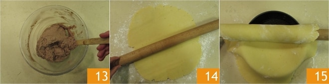 Mélangez bien avec une maryse, jusqu'à obtenir une crème uniforme. Couvrez avec un film plastique et transférez au réfrigérateur jusqu'à utilisation. Dès que la pâte sablée aura reposé, transférez-la sur le plan de travail fariné et étalez-la jusqu'à obtenir une épaisseur de 5 mm 14. Enroulez-la sur le rouleau à pâtisserie et transférez-la délicatement à l'intérieur d'un moule de 22 cm de diamètre 15.