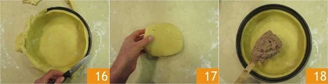 Faites une légère pression avec les mains, de manière à bien faire adhérer la pâte au moule. Avec un petit couteau, éliminez l'excédent de pâte sur les bords 16. Travaillez rapidement tous les restes de pâte sablée 17, ils serviront à faire les losanges. Reprenez la crème de ricotta et Nutella du réfrigérateur et utilisez-la pour garnir le fond de pâte sablée 18.
