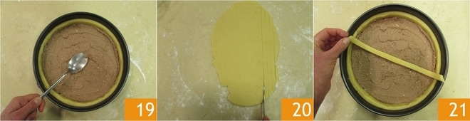 Nivelez bien la surface avec une cuillère 19. Étalez donc le reste de la pâte sablée, toujours jusqu'à obtenir une épaisseur de 5 mm. Réalisez des bandelettes d'environ 1,5 cm de large 20. Disposez les bandelettes sur la tarte, d'abord dans un sens 21